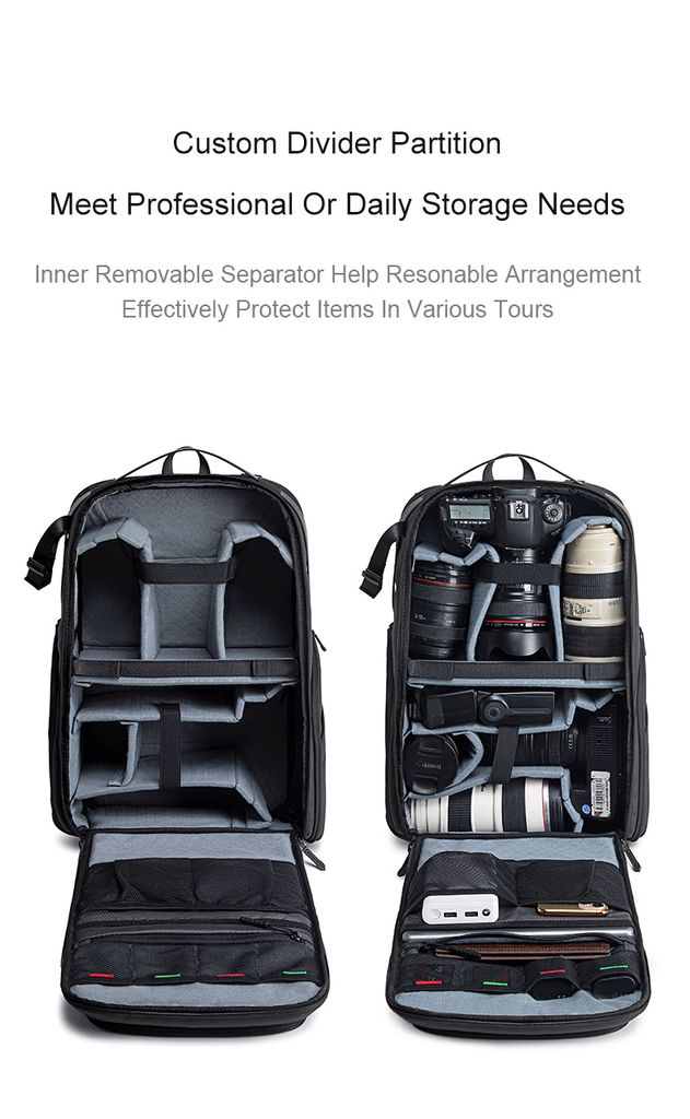 Mochila resistente à prova d’água e choque, com compartimentos para câmera, drone, laptop de até 15,6″, tripé e acessórios. Capacidade de aproximadamente 25,5 L.